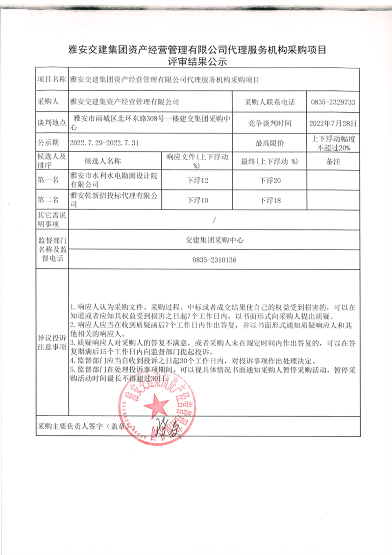 雅安交建集團(tuán)資產(chǎn)經(jīng)營(yíng)管理有限公司代理服務(wù)機(jī)構(gòu)采購(gòu)項(xiàng)目評(píng)審結(jié)果公示