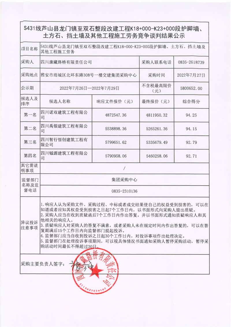 四川康藏路橋有限責(zé)任公司S431線蘆山縣龍門(mén)鎮(zhèn)至雙石整段改建工程K18+000-K23+000段護(hù)腳墻、土方石、擋土墻及其他工程施工勞務(wù)競(jìng)爭(zhēng)談判結(jié)果公示