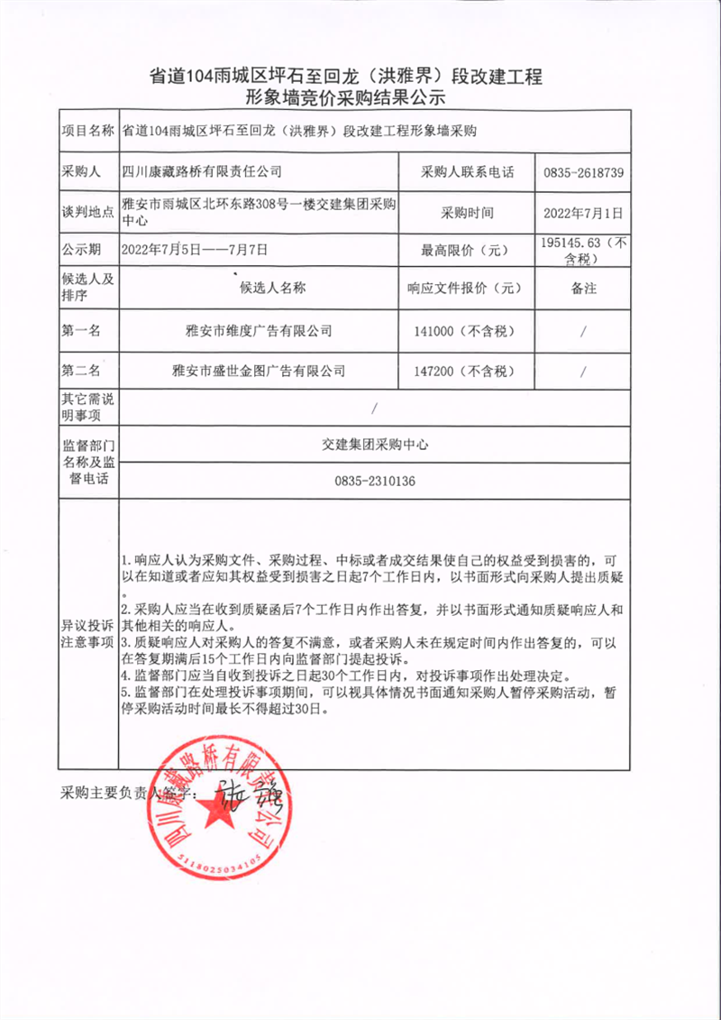 四川康藏路橋有限責(zé)任公司省道104雨城區(qū)坪石至回龍(洪雅界)段改建工程形象墻競(jìng)價(jià)采購(gòu)結(jié)果公示