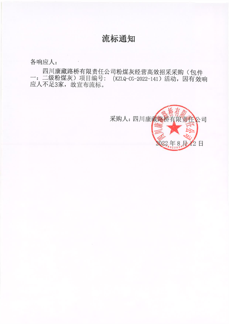 四川康藏路橋有限責(zé)任公司粉煤灰經(jīng)營高效招采采購(包件一:二級粉煤灰)流標(biāo)通知