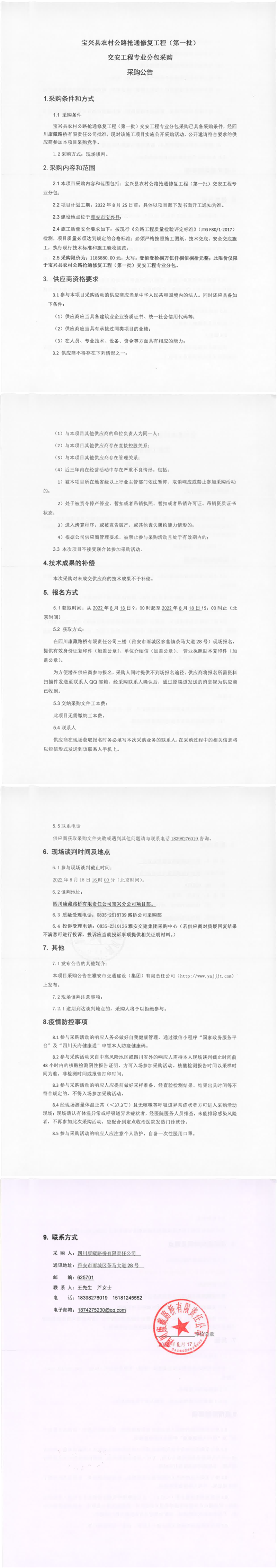 四川康藏路橋有限責任公司寶興縣農(nóng)村公路搶通修復工程(第一批)交安工程專業(yè)分包采購采購公告