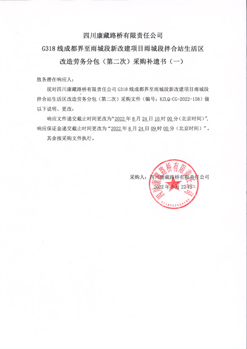 四川康藏路橋有限責(zé)任公司G318線(xiàn)成都界至雨城段新改建項(xiàng)目雨城段拌合站生活區(qū)改造勞務(wù)分包(第二次)采購(gòu)補(bǔ)遺書(shū)(一)
