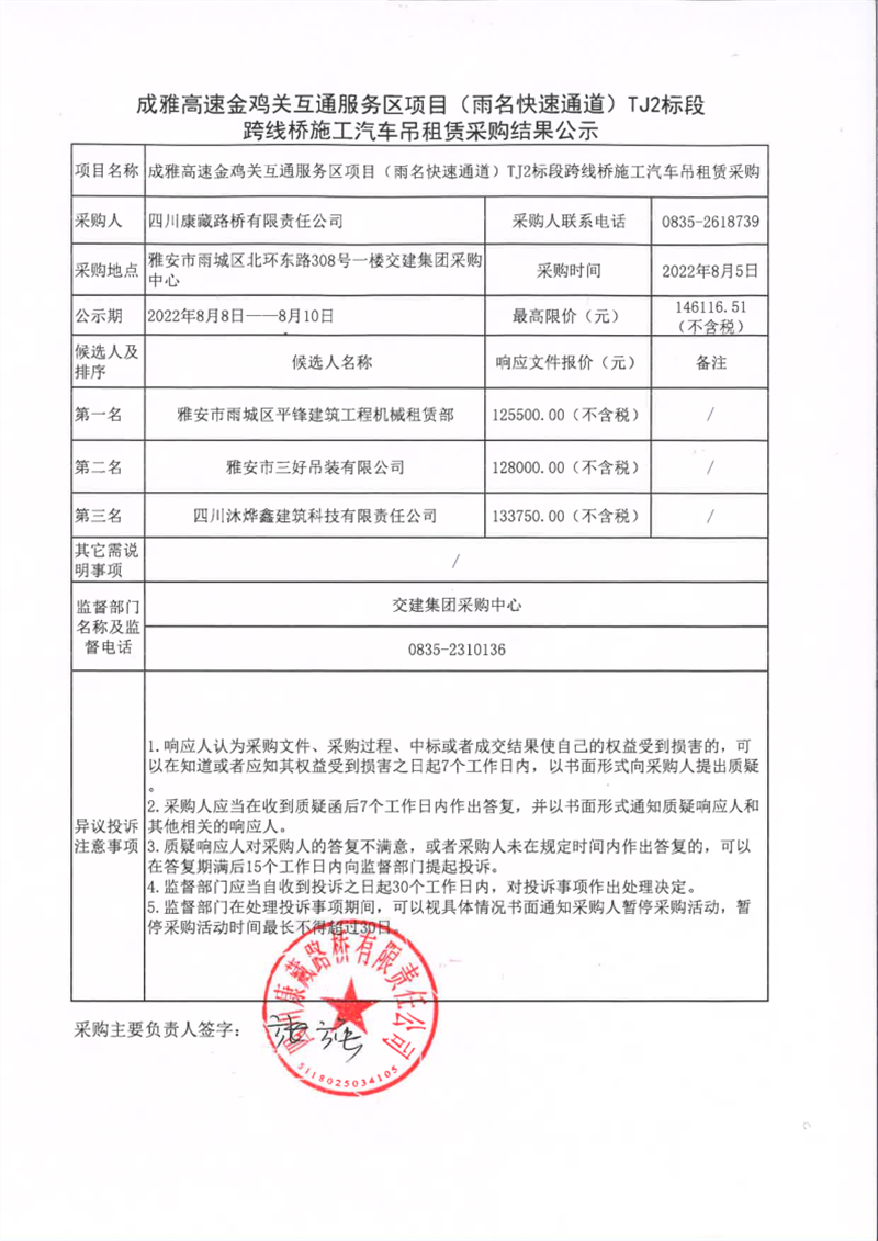 四川康藏路橋有限責任公司成雅高速金雞關(guān)互通服務(wù)區(qū)項目(雨名快速通道)TJ2標段跨線橋施工汽車吊租賃采購結(jié)果公示