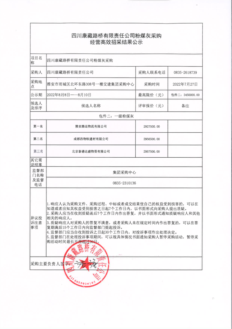 四川康藏路橋有限責任公司粉煤灰采購經(jīng)營高效招采結(jié)果公示