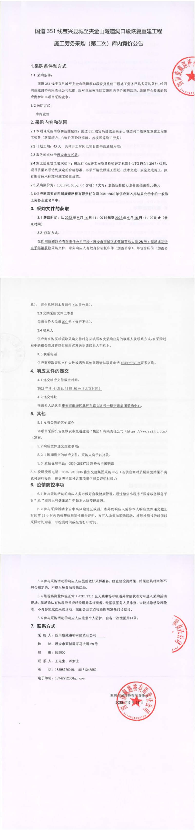 四川康藏路橋有限責(zé)任公司國道351線寶興縣城至夾金山隧道洞口段恢復(fù)重建工程施工勞務(wù)采購(第二次)庫內(nèi)競(jìng)價(jià)公告