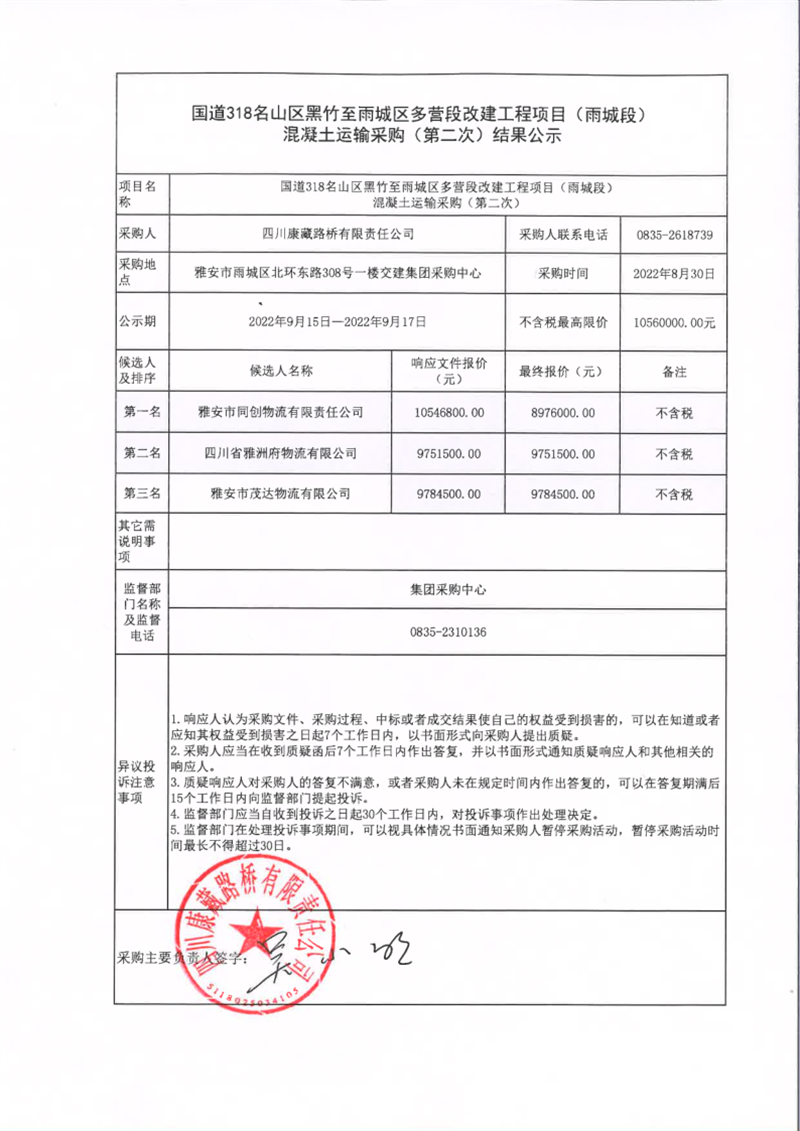 四川康藏路橋有限責(zé)任公司國道318名山區(qū)黑竹至雨城區(qū)多營段改建工程項目(雨城段)混凝土運輸采購(第二次)結(jié)果公示