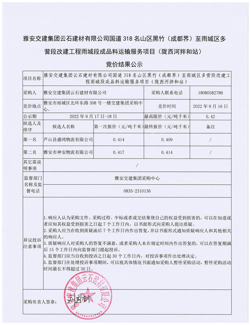 雅安交建集團(tuán)云石建材有限公司國道318名山區(qū)黑竹(成都界)至雨城區(qū)多營段改建工程雨城段成品料運(yùn)輸服務(wù)項(xiàng)目(隴西河拌和站)競價(jià)結(jié)果公示