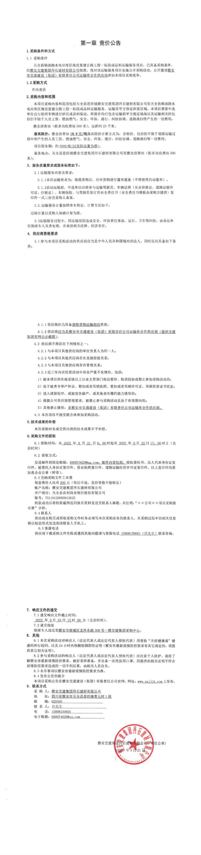 雅安交建集團丹石建材有限公司天全縣鍋浪蹺水電站庫區(qū)淹沒復建公路工程一標段成品料運輸服務項目競價公告