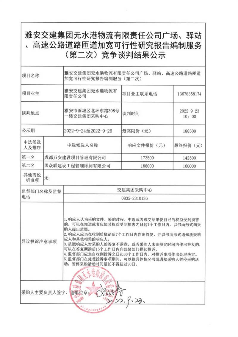 雅安交建集團無水港物流有限責(zé)任公司廣場、驛站、高速公路道路匝道加寬可行性研究報告編制服務(wù)(第二次)競爭談判結(jié)果公示