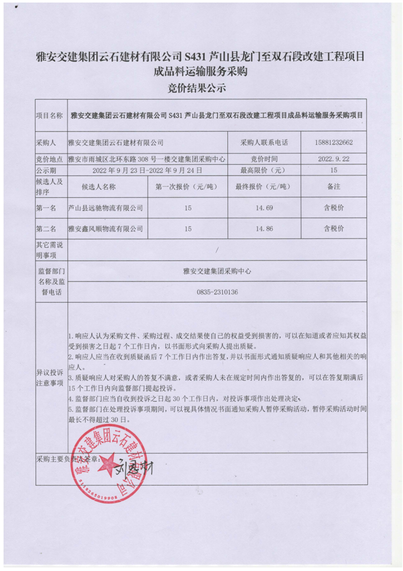雅安交建集團(tuán)云石建材有限公司S431蘆山縣龍門(mén)至雙石段改建工程項(xiàng)目成品料運(yùn)輸服務(wù)采購(gòu)競(jìng)價(jià)結(jié)果公示