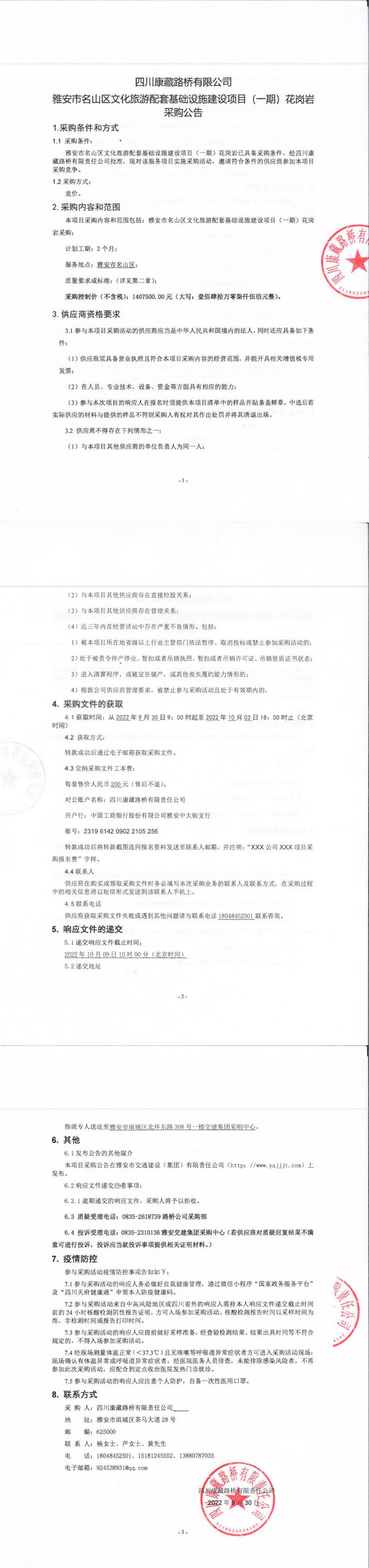 四川康藏路橋有限公司雅安市名山區(qū)文化旅游配套基礎設施建設項目(一期)花崗巖采購公告