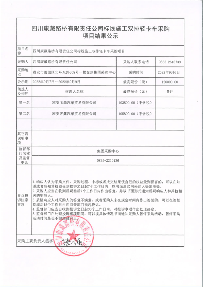 四川康藏路橋有限責任公司標線施工雙排輕卡車采購項目結(jié)果公示