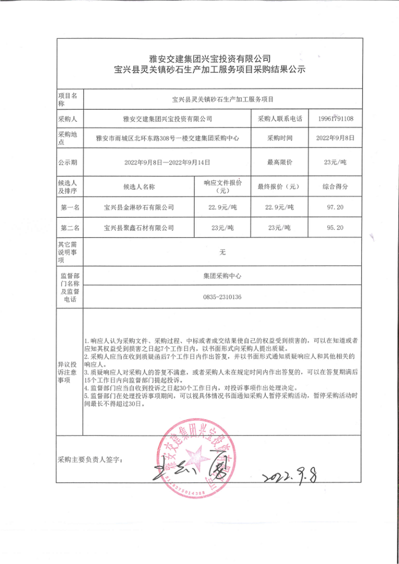 雅安交建集團興寶投資有限公司寶興縣靈關鎮(zhèn)砂石生產(chǎn)加工服務項目采購結果公示