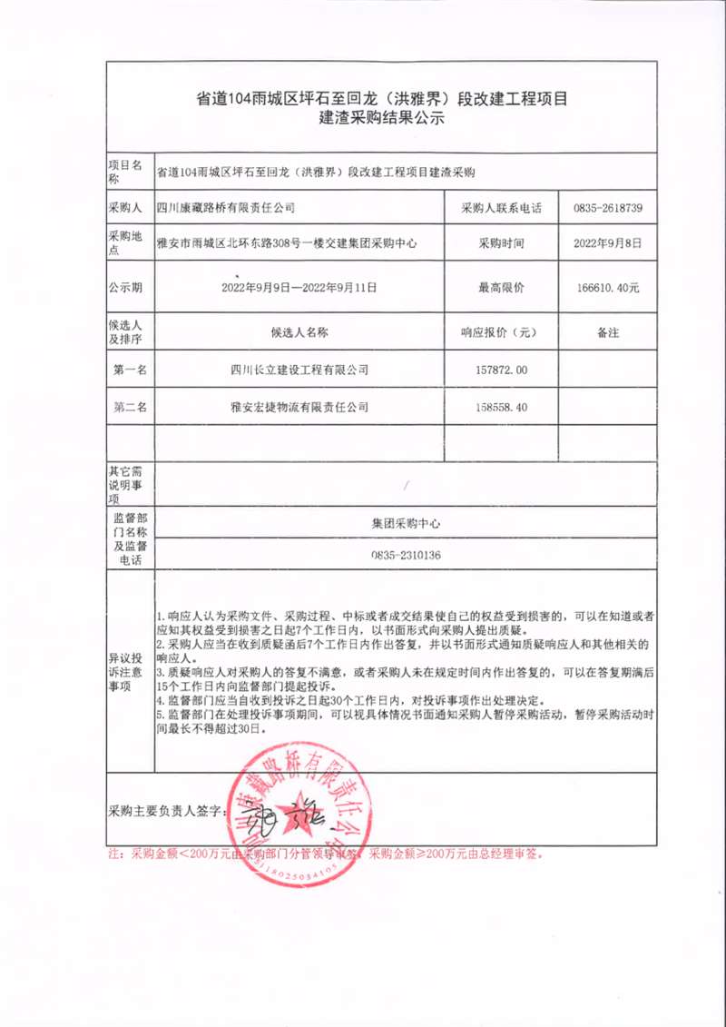 四川康藏路橋有限責任公司省道104雨城區(qū)坪石至回龍(洪雅界)段改建工程項目建渣采購結果公示