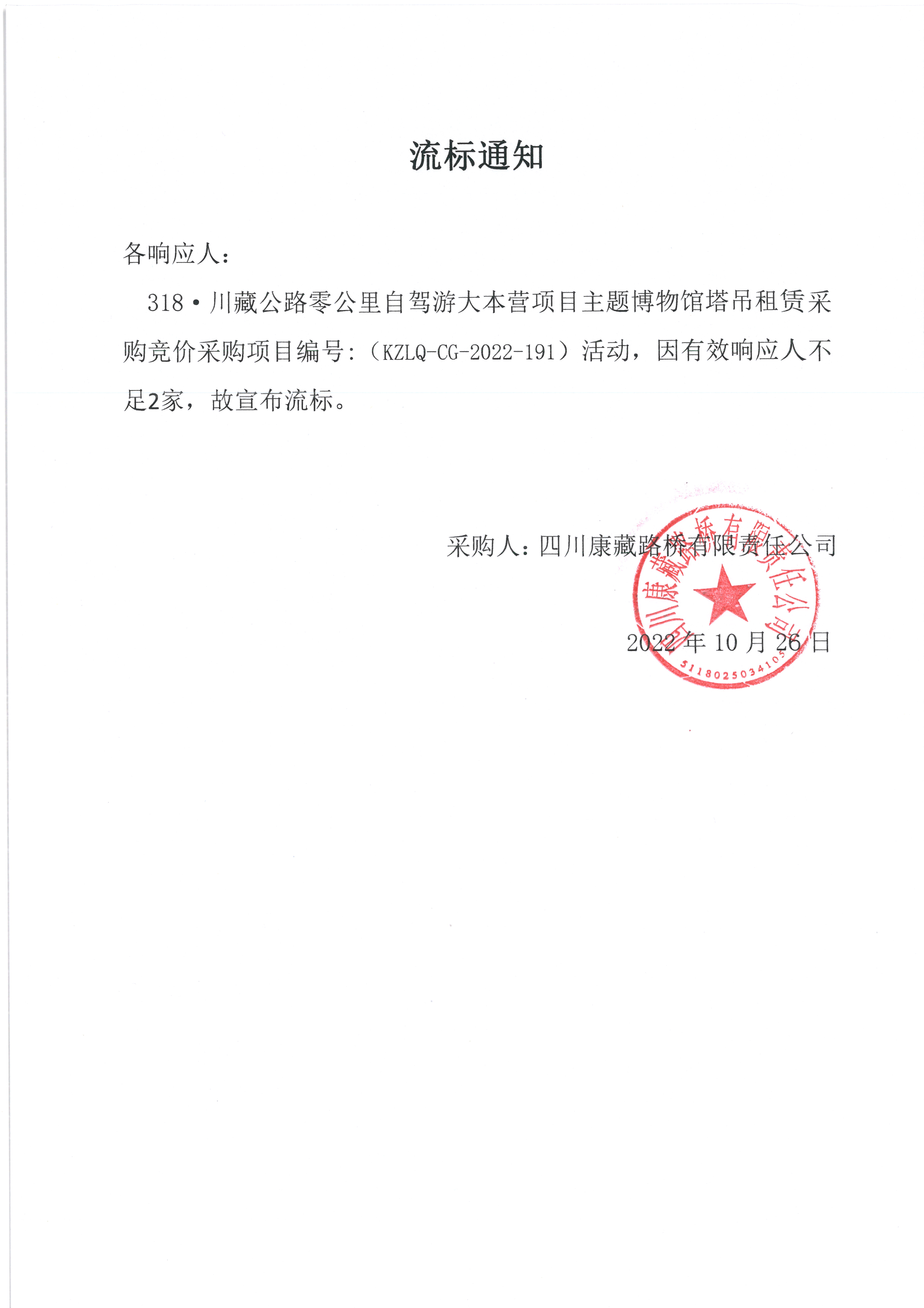 四川康藏路橋有限責任公司318·川藏公路零公里自駕游大本營項目主題博物館塔吊租賃采購流標通知