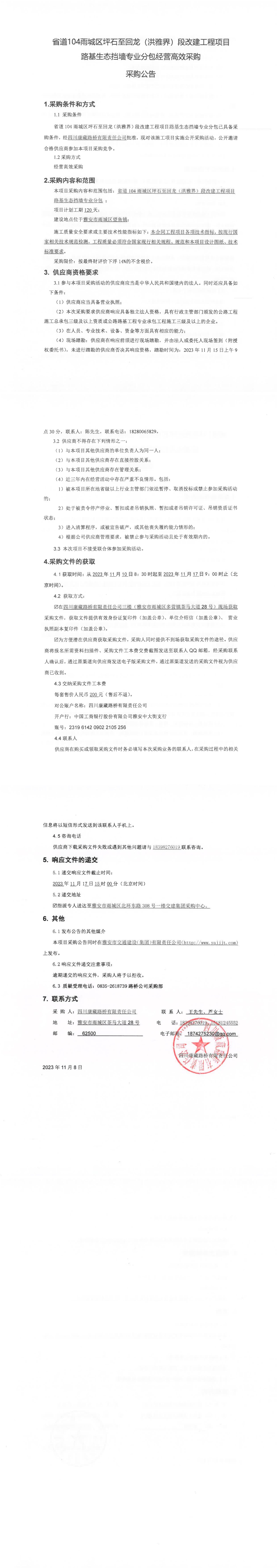 四川康藏路橋有限責任公司省道104雨城區(qū)坪石至回龍(洪雅界)段改建工程項目路基生態(tài)擋墻專業(yè)分包經(jīng)營高效采購公告