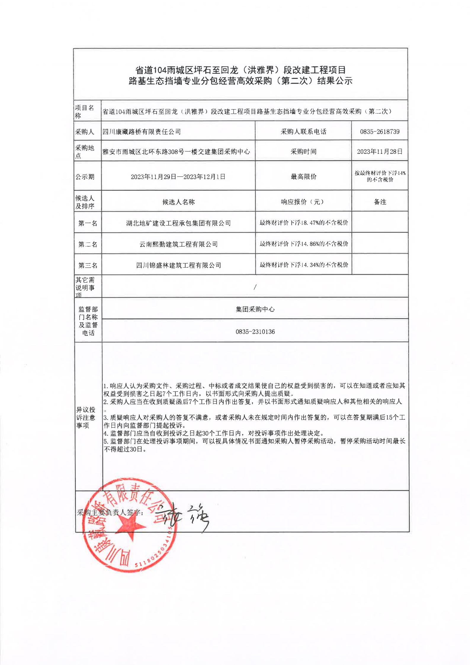 四川康藏路橋有限責(zé)任公司省道104雨城區(qū)坪石至回龍(洪雅界)段改建工程項(xiàng)目路基生態(tài)擋墻專業(yè)分包經(jīng)營高效采購(第二次)結(jié)果公示