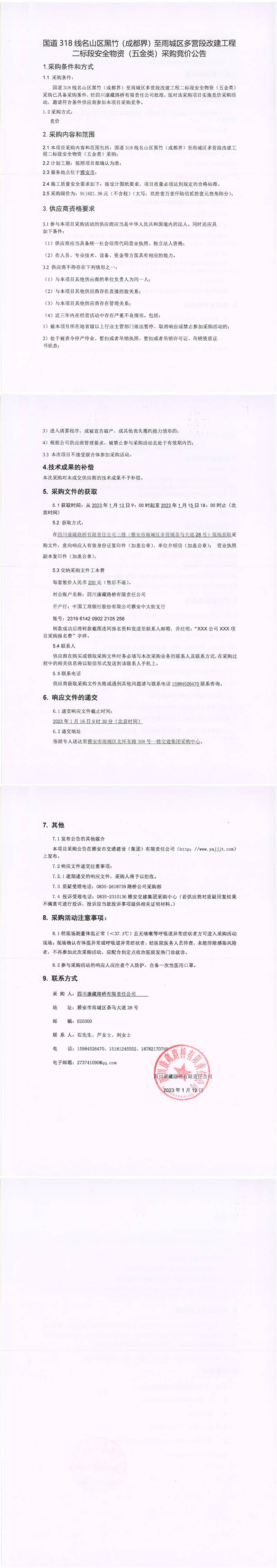 四川康藏路橋有限責任公司國道318線名山區(qū)黑竹(成都界)至雨城區(qū)多營段改建工程二標段安全物資(五金類)采購競價公告