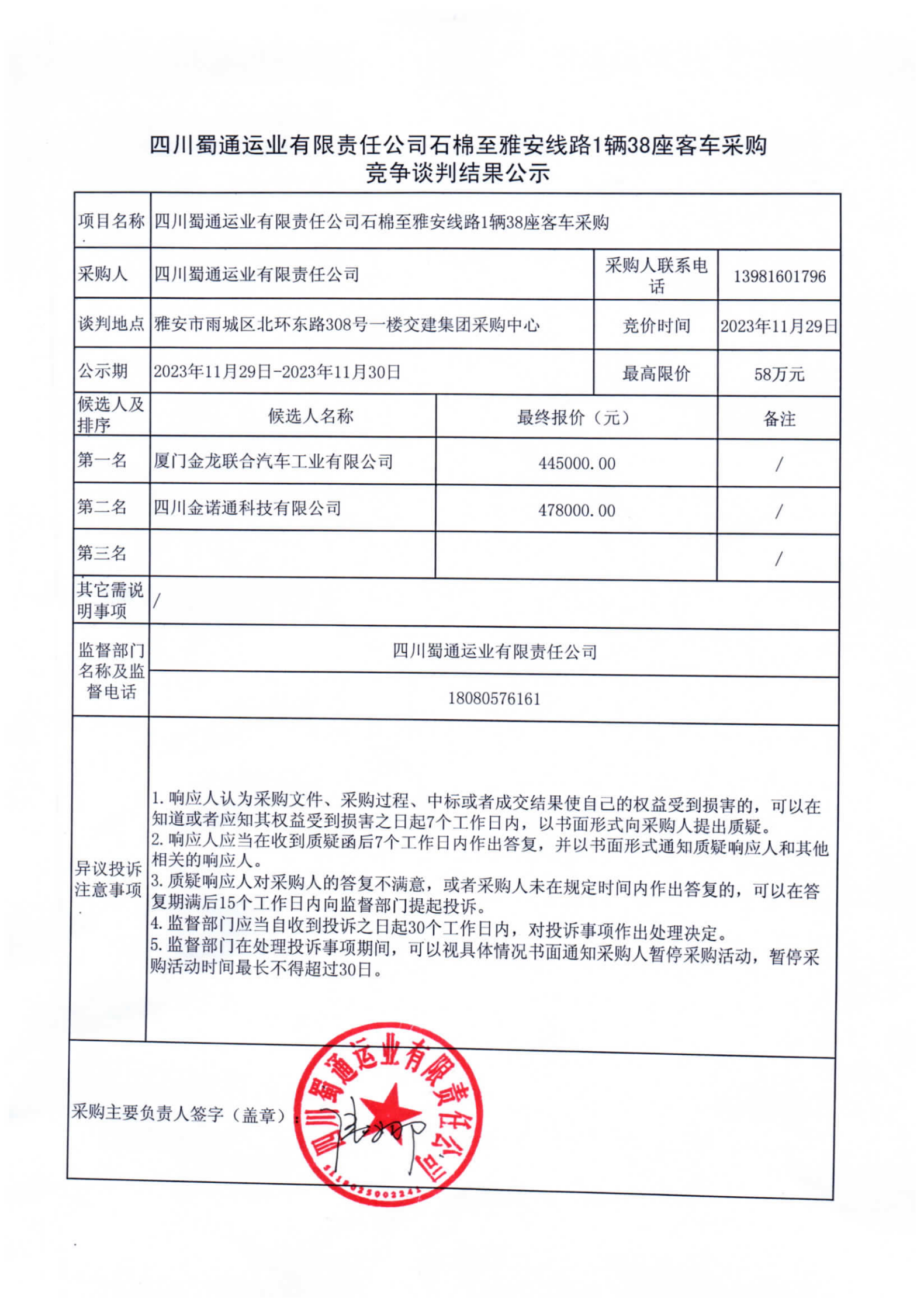 四川蜀通運業(yè)有限責(zé)任公司石棉至雅安線路1輛38座客車采購競爭談判結(jié)果公示