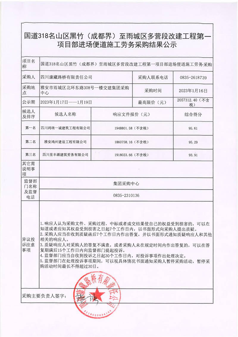 四川康藏路橋有限責(zé)任公司國道318名山區(qū)黑竹(成都界)至雨城區(qū)多營段改建工程第一項(xiàng)目部進(jìn)場便道施工勞務(wù)采購結(jié)果公示