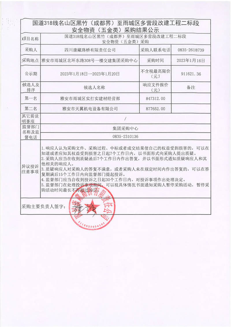 四川康藏路橋有限責(zé)任公司國(guó)道318線(xiàn)名山區(qū)黑竹(成都界)至雨城區(qū)多營(yíng)段改建工程二標(biāo)段安全物資(五金類(lèi))采購(gòu)結(jié)果公示