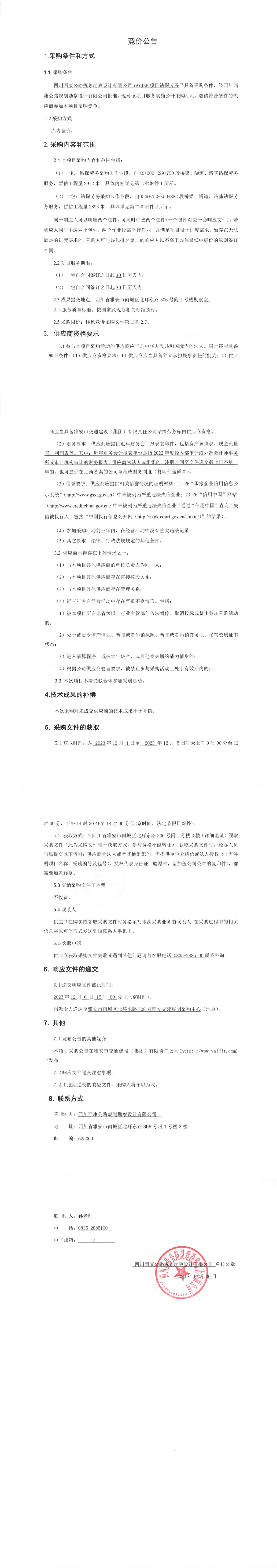 四川西康公路規(guī)劃勘察設計有限公司YAYJSP目鉆探勞務競價公告
