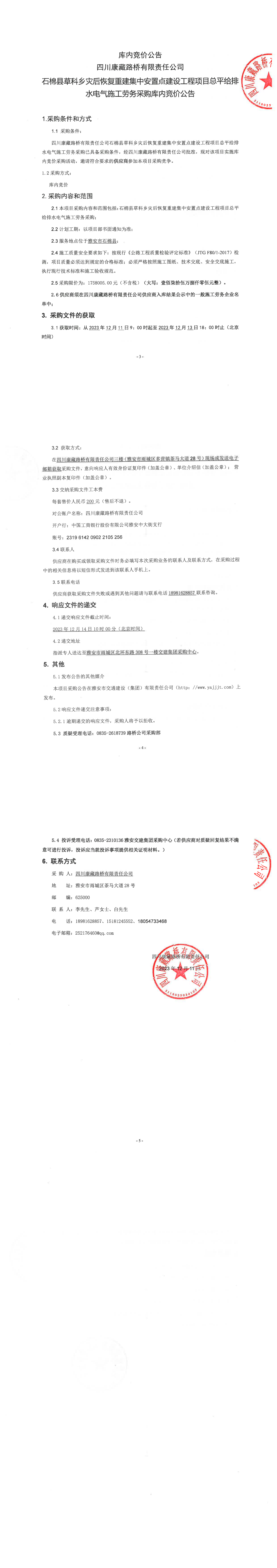 四川康藏路橋有限責(zé)任公司石棉縣草科鄉(xiāng)災(zāi)后恢復(fù)重建集中安置點建設(shè)工程項目總平給排水電氣施工勞務(wù)采購庫內(nèi)競價公告
