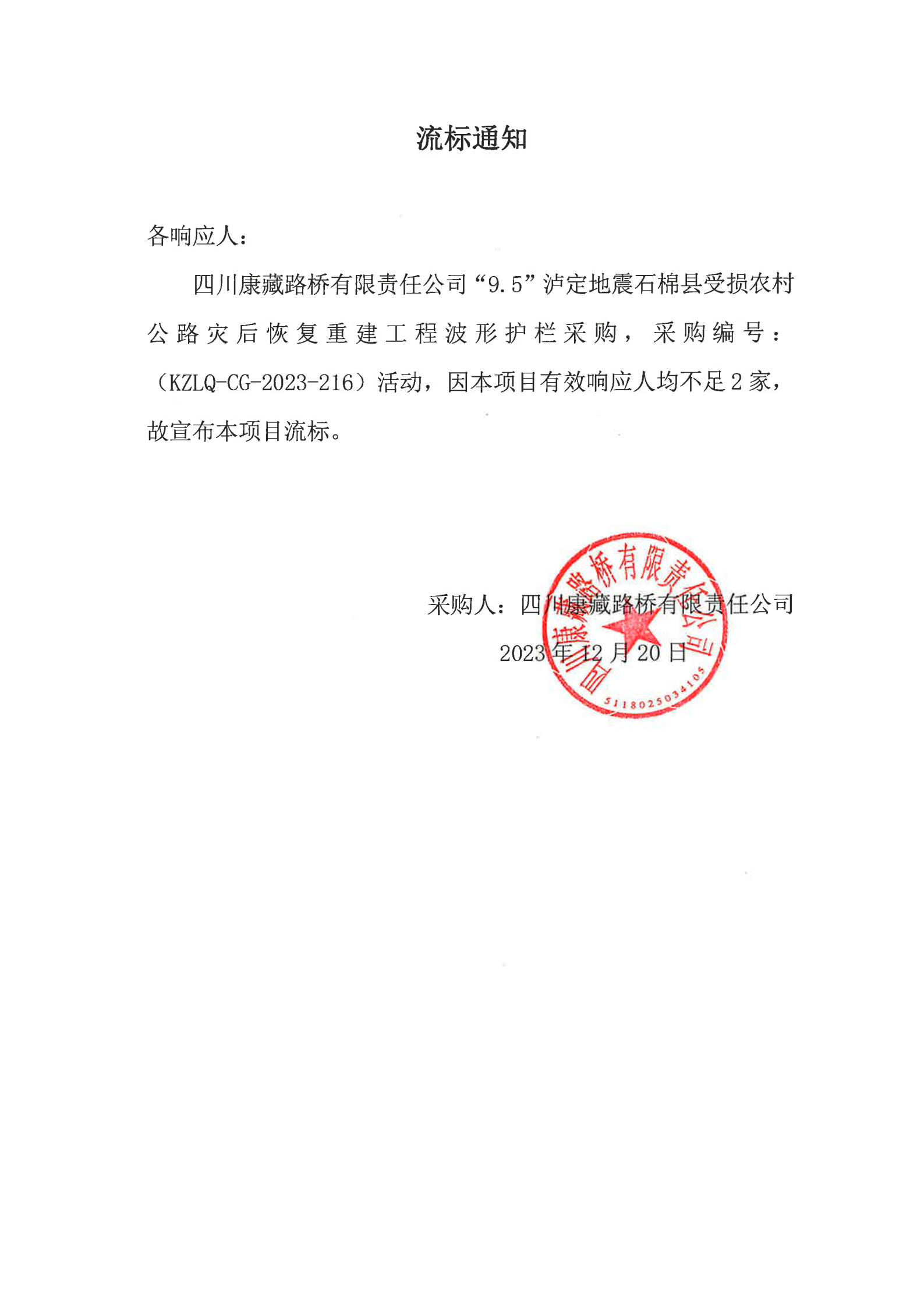 四川康藏路橋有限責(zé)任公司“9.5”瀘定地震石棉縣受損農(nóng)村公路災(zāi)后恢復(fù)重建工程波形護(hù)欄采購(gòu)流標(biāo)通知