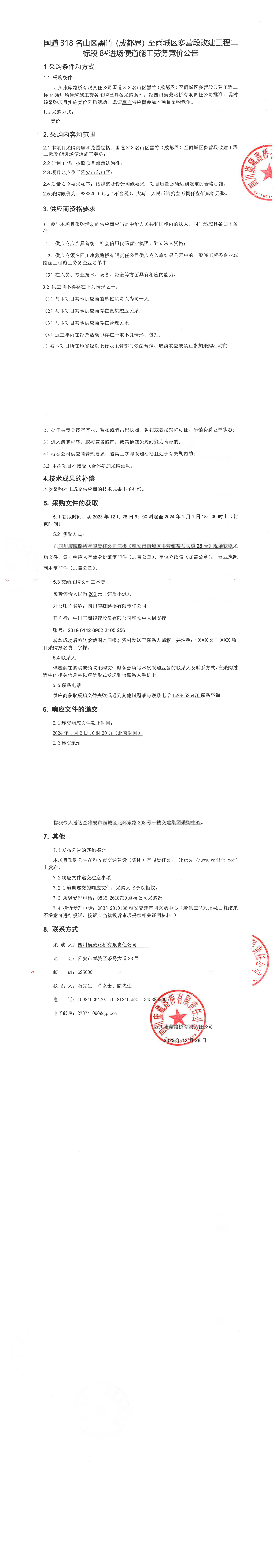四川康藏路橋有限責(zé)任公司國(guó)道318名山區(qū)黑竹(成都界)至雨城區(qū)多營(yíng)段改建工程二標(biāo)段8#進(jìn)場(chǎng)便道施工勞務(wù)競(jìng)價(jià)公告