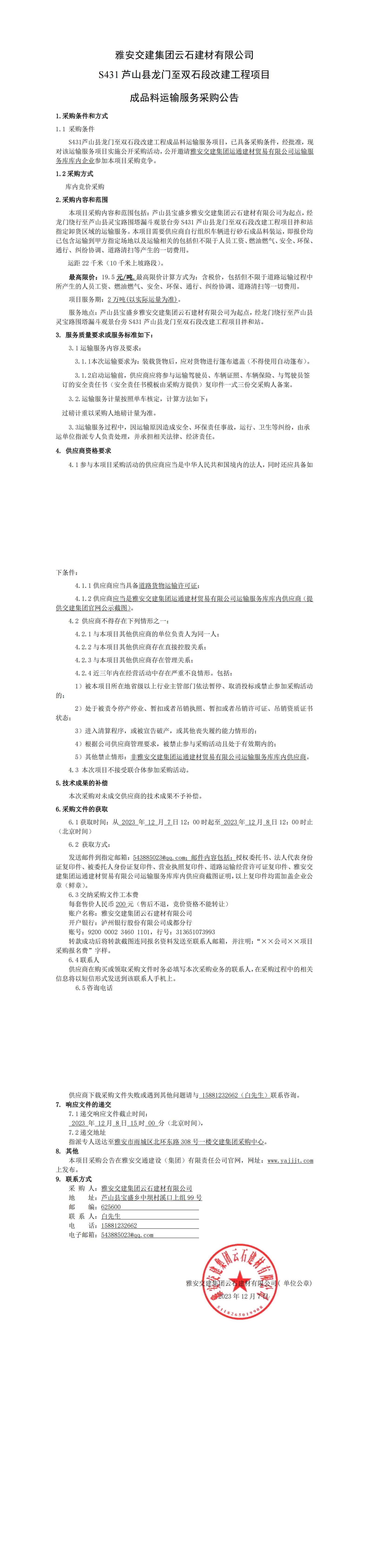 雅安交建集團(tuán)云石建材有限公司S431蘆山縣龍門(mén)至雙石段改建工程項(xiàng)目成品料運(yùn)輸服務(wù)采購(gòu)公告