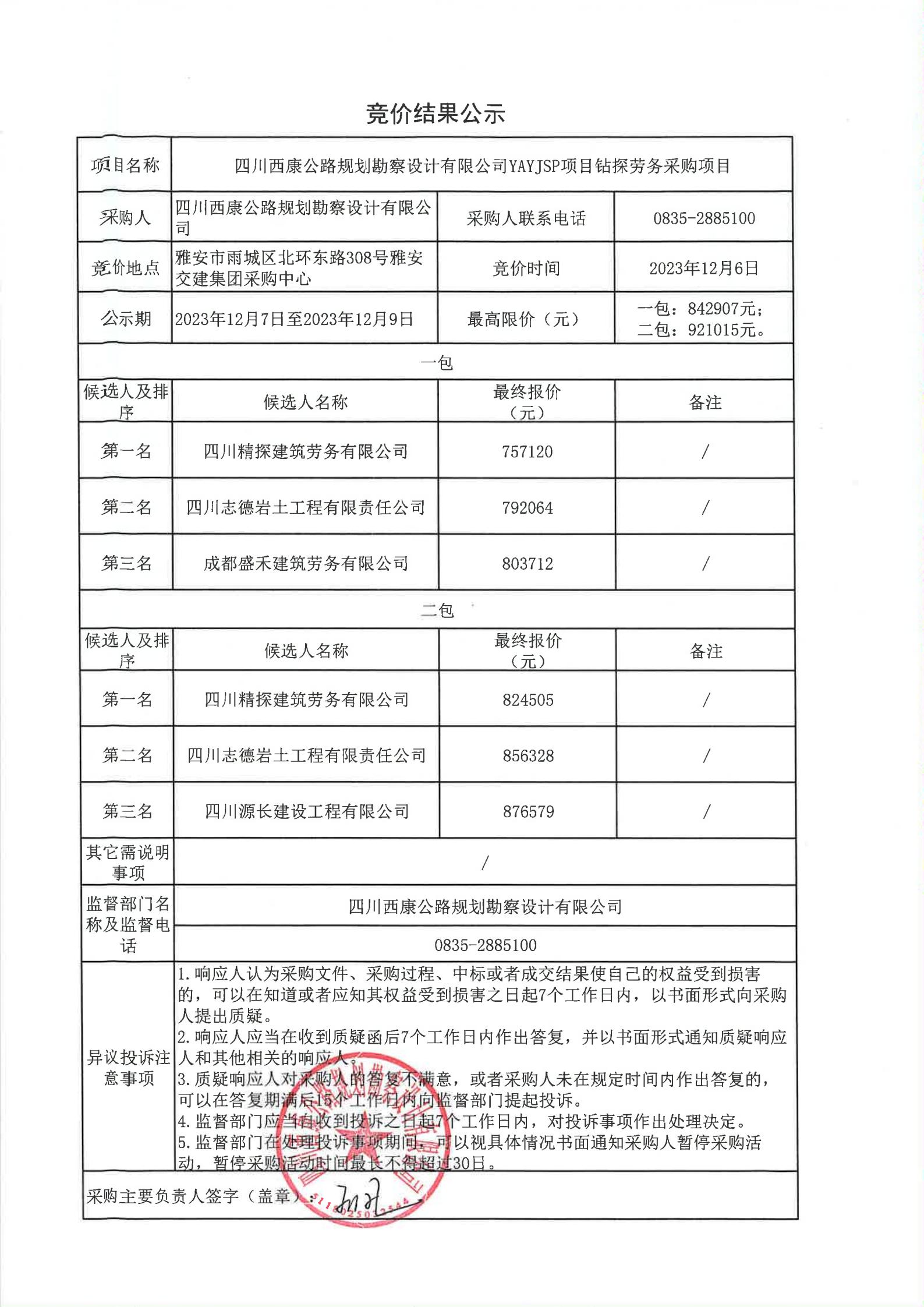 四川西康公路規(guī)劃勘察設(shè)計(jì)公司YAYJSP項(xiàng)目鉆探勞務(wù)采購項(xiàng)目競價(jià)結(jié)果公示
