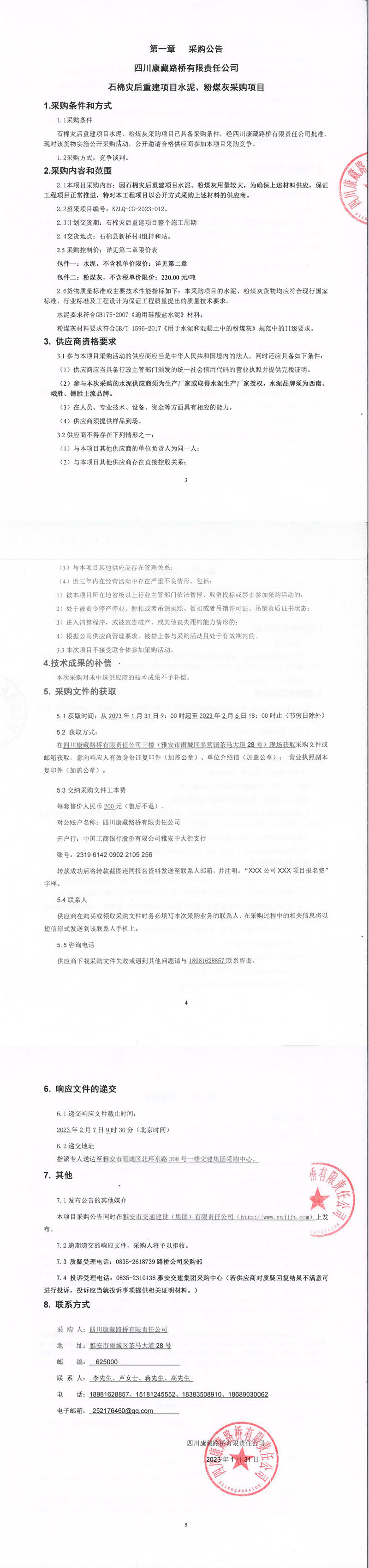 四川康藏路橋有限責任公司石棉災(zāi)后重建項目水泥、粉煤灰采購項目采購公告