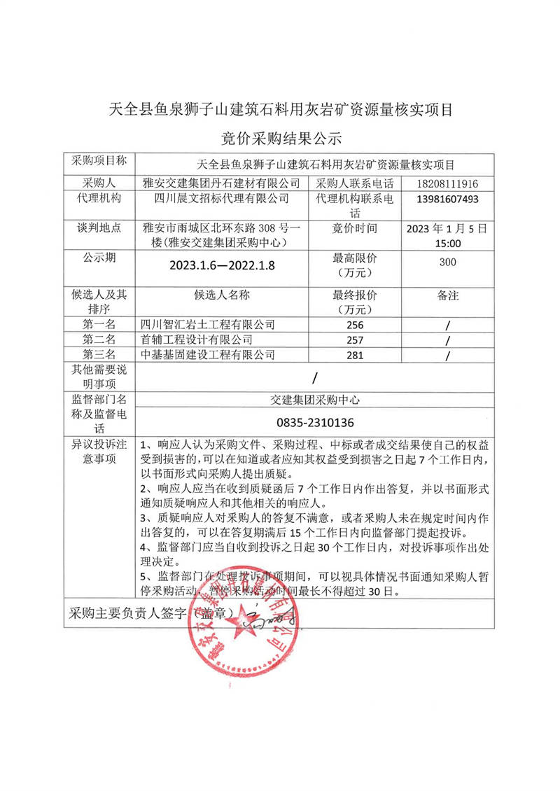 雅安交建集團(tuán)丹石建材有限公司天全縣魚泉獅子山建筑石料用灰?guī)r礦資源量核實(shí)項(xiàng)目競(jìng)價(jià)采購結(jié)果公示