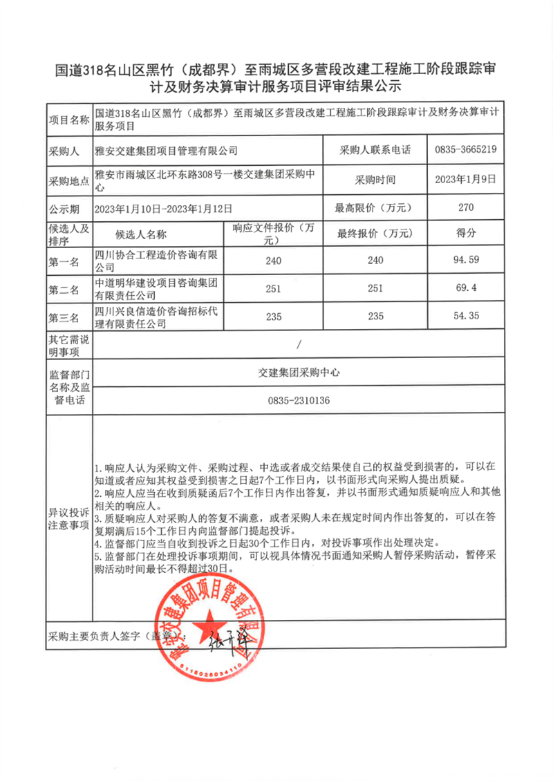 雅安交建集團(tuán)項(xiàng)目管理有限公司國道318名山區(qū)黑竹(成都界)至雨城區(qū)多營段改建工程施工階段跟蹤審計(jì)及財(cái)務(wù)決算審計(jì)服務(wù)項(xiàng)目評審結(jié)果公示