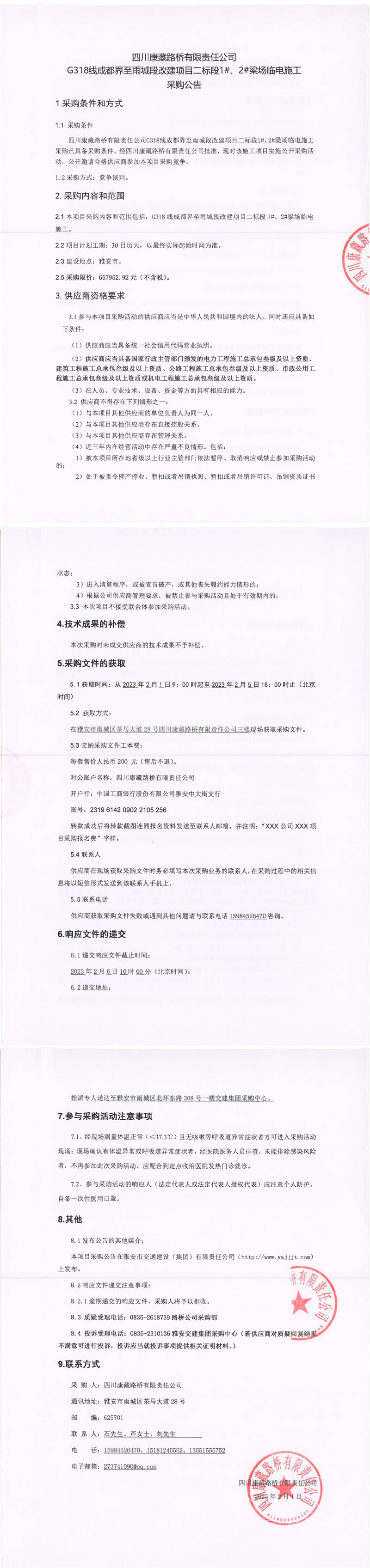 四川康藏路橋有限責任公司G318線成都界至雨城段改建項目二標段1#、2#梁場臨電施工采購公告