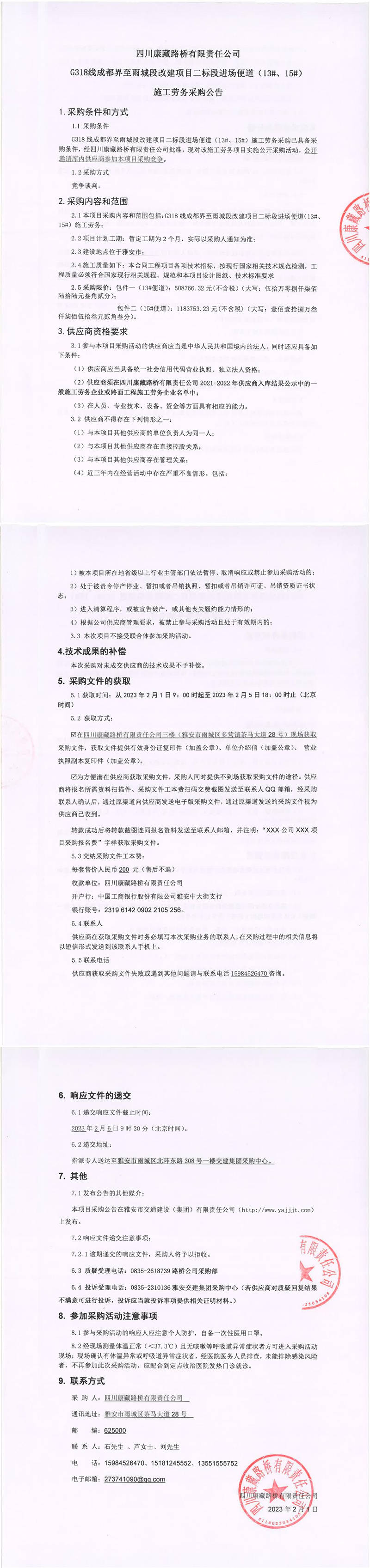 四川康藏路橋有限責(zé)任公司G318線成都界至雨城段改建項目二標(biāo)段進(jìn)場便道(13#、15#)施工勞務(wù)采購公告