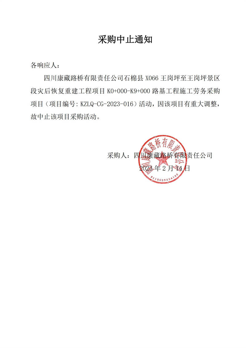 四川康藏路橋有限責(zé)任公司石棉縣X066王崗坪至王崗坪景區(qū)段災(zāi)后恢復(fù)重建工程項(xiàng)目K0+000-K9+000路基工程施工勞務(wù)采購(gòu)中止公告