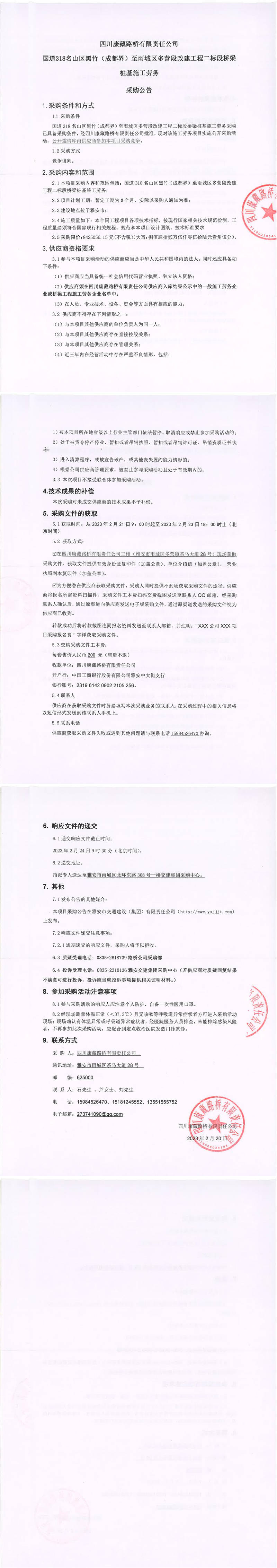 四川康藏路橋有限責任公司國道318名山區(qū)黑竹(成都界)至雨城區(qū)多營段改建工程二標段橋梁樁基施工勞務