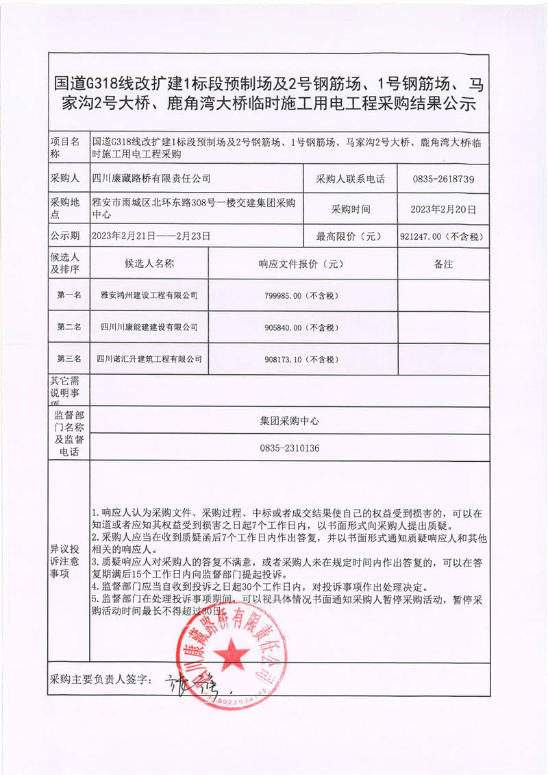四川康藏路橋有限責任公司國道318線改擴建1標段預制場及2號鋼筋場、1號鋼筋場、馬家溝2號大橋、鹿角灣大橋臨時施工用電工程采購結果公示