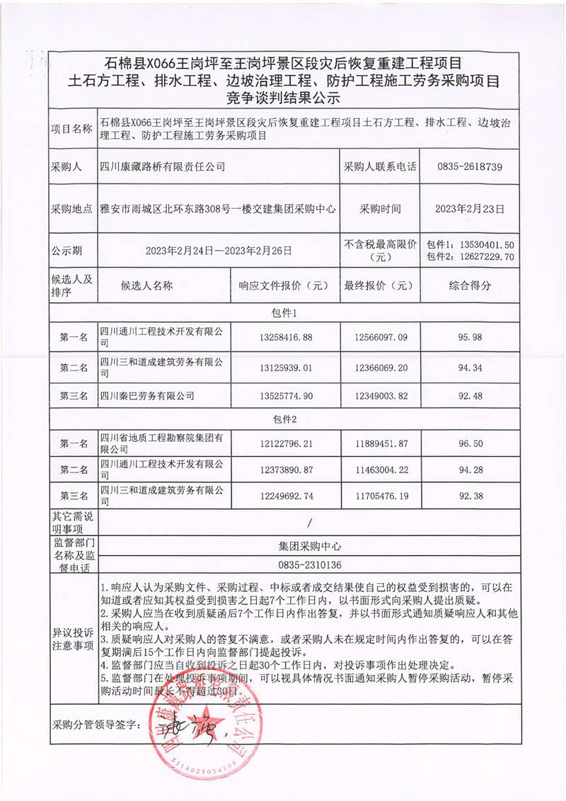 四川康藏路橋有限責(zé)任公司石棉縣X066王崗坪至王崗坪景區(qū)段災(zāi)后恢復(fù)重建工程項目土石方工程、排水工程、邊坡治理工程、防護(hù)工程施工勞務(wù)采購項目競爭談判結(jié)果公示