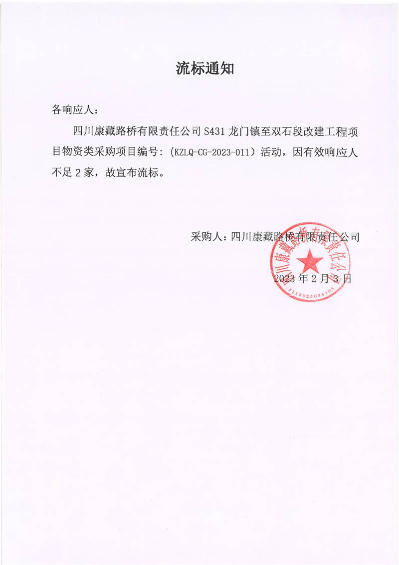 四川康藏路橋有限責(zé)任公司S431龍門鎮(zhèn)至雙石段改建工程項目物資類采購流標(biāo)通知
