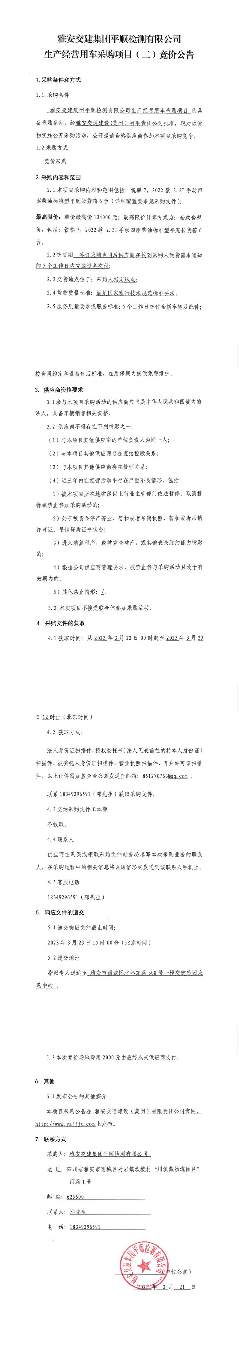 雅安交建集團平順檢測有限公司平順公司生產(chǎn)經(jīng)營用車采購項目(二)競價公告
