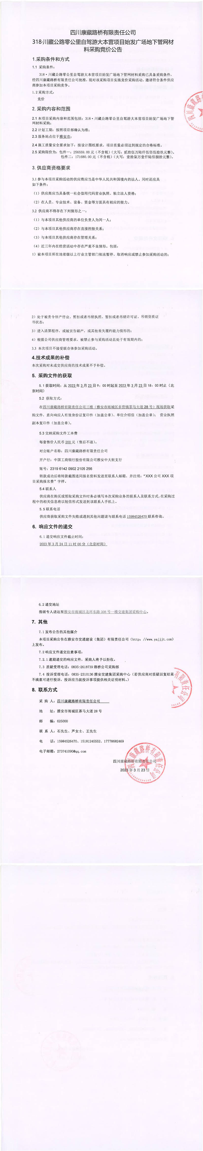 四川康藏路橋有限責(zé)任公司318·川藏公路零公里自駕游大本營項目始發(fā)廣場地下管網(wǎng)材料采購競價公告