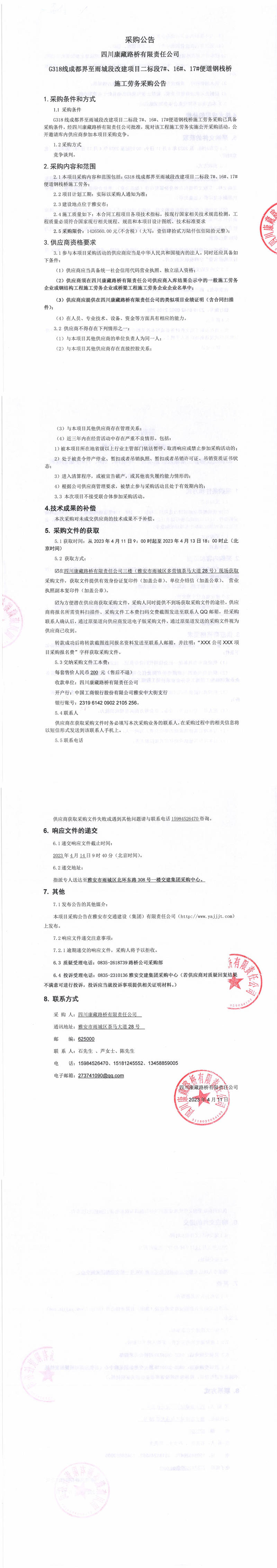 四川康藏路橋有限責任公司G318線成都界至雨城段改建項目二標段7#、16#、17#便道鋼棧橋施工勞務(wù)采購公告