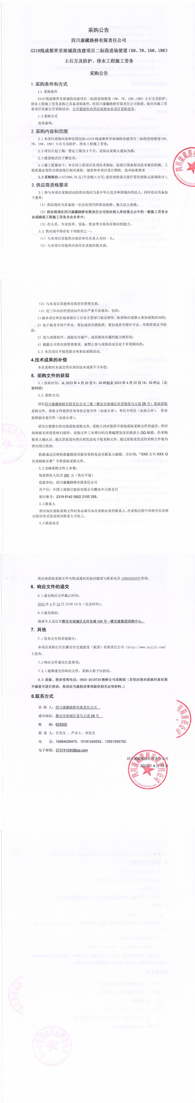四川康藏路橋有限責(zé)任公司G318線成都至雨城段改建項目二標(biāo)段進場便道(6#、7#、16#、18#)土石方及防護、排水工程施工勞務(wù)