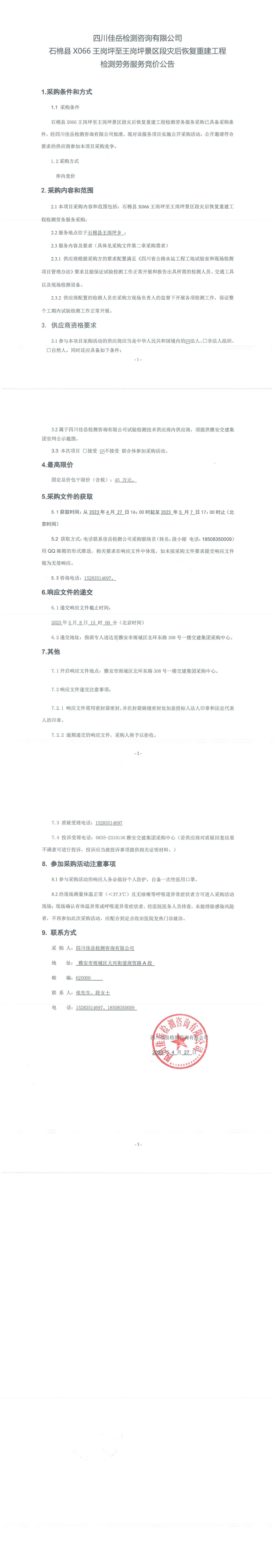 四川佳岳檢測(cè)咨詢有限公司石棉縣X066王崗坪至王崗坪景區(qū)段災(zāi)后恢復(fù)重建工程檢測(cè)勞務(wù)服務(wù)競(jìng)價(jià)公告