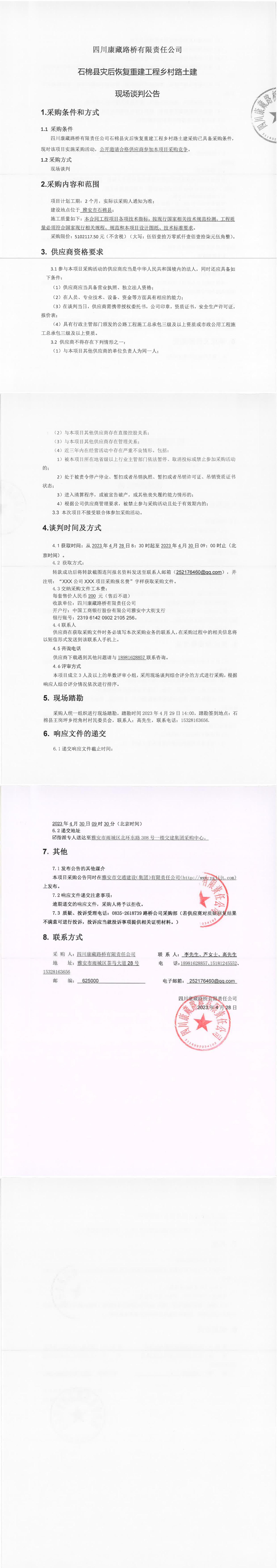 四川康藏路橋有限責任公司石棉縣災后恢復重建工程鄉(xiāng)村路土建現(xiàn)場談判公告