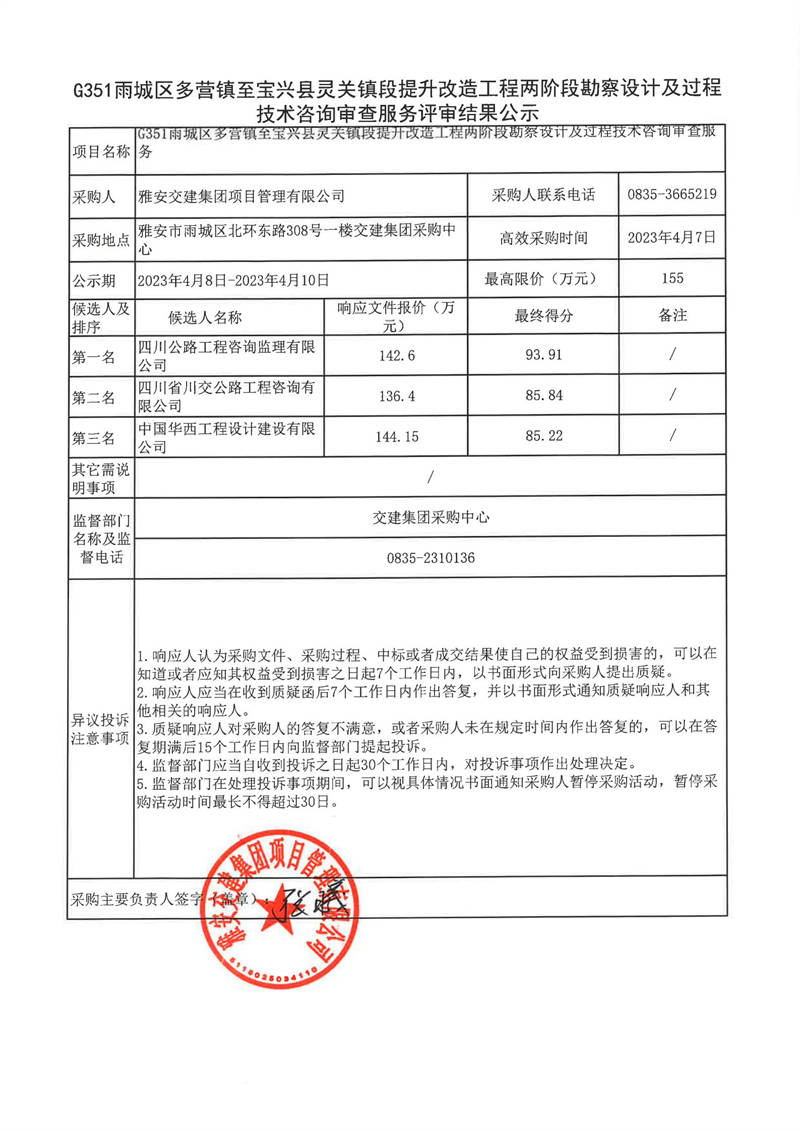 雅安交建集團(tuán)項(xiàng)目管理有限公司G351雨城區(qū)多營(yíng)鎮(zhèn)至寶興縣靈關(guān)鎮(zhèn)段提升改造工程兩階段勘察設(shè)計(jì)及過(guò)程技術(shù)咨詢審查服務(wù)評(píng)審結(jié)果公示