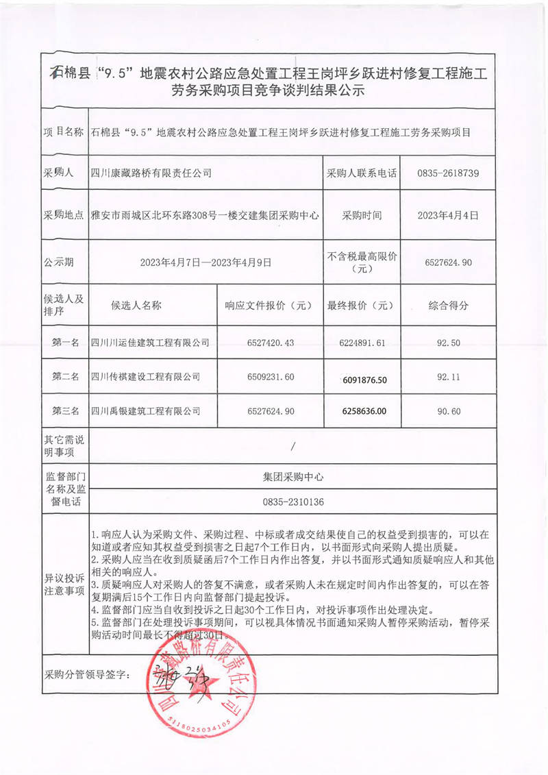 四川康藏路橋有限責任公司石棉縣“9.5”地震農(nóng)村公路應急處置工程王崗坪鄉(xiāng)躍進村修復工程施工勞務采購項目競爭談判結(jié)果公示