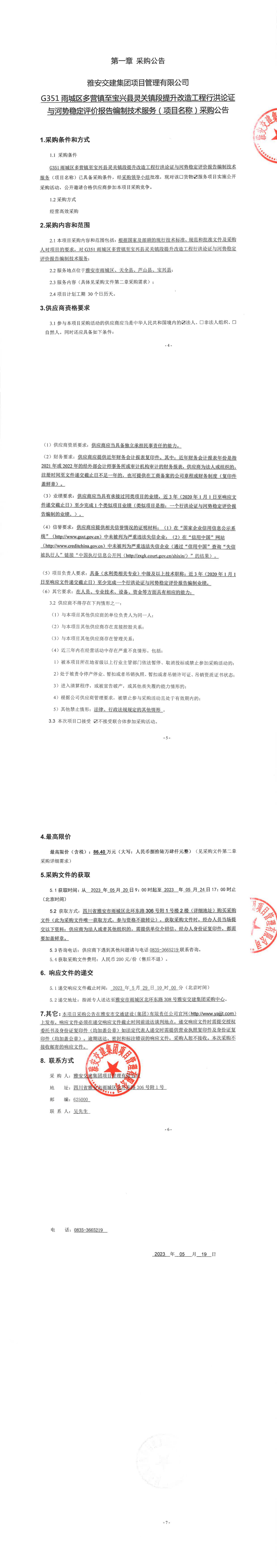 雅安交建集團(tuán)項(xiàng)目管理有限公司G351雨城區(qū)多營(yíng)鎮(zhèn)至寶興縣靈關(guān)鎮(zhèn)段提升改造工程行洪論證與河勢(shì)穩(wěn)定評(píng)價(jià)報(bào)告編制技術(shù)服務(wù)(項(xiàng)目名稱)采購(gòu)公告
